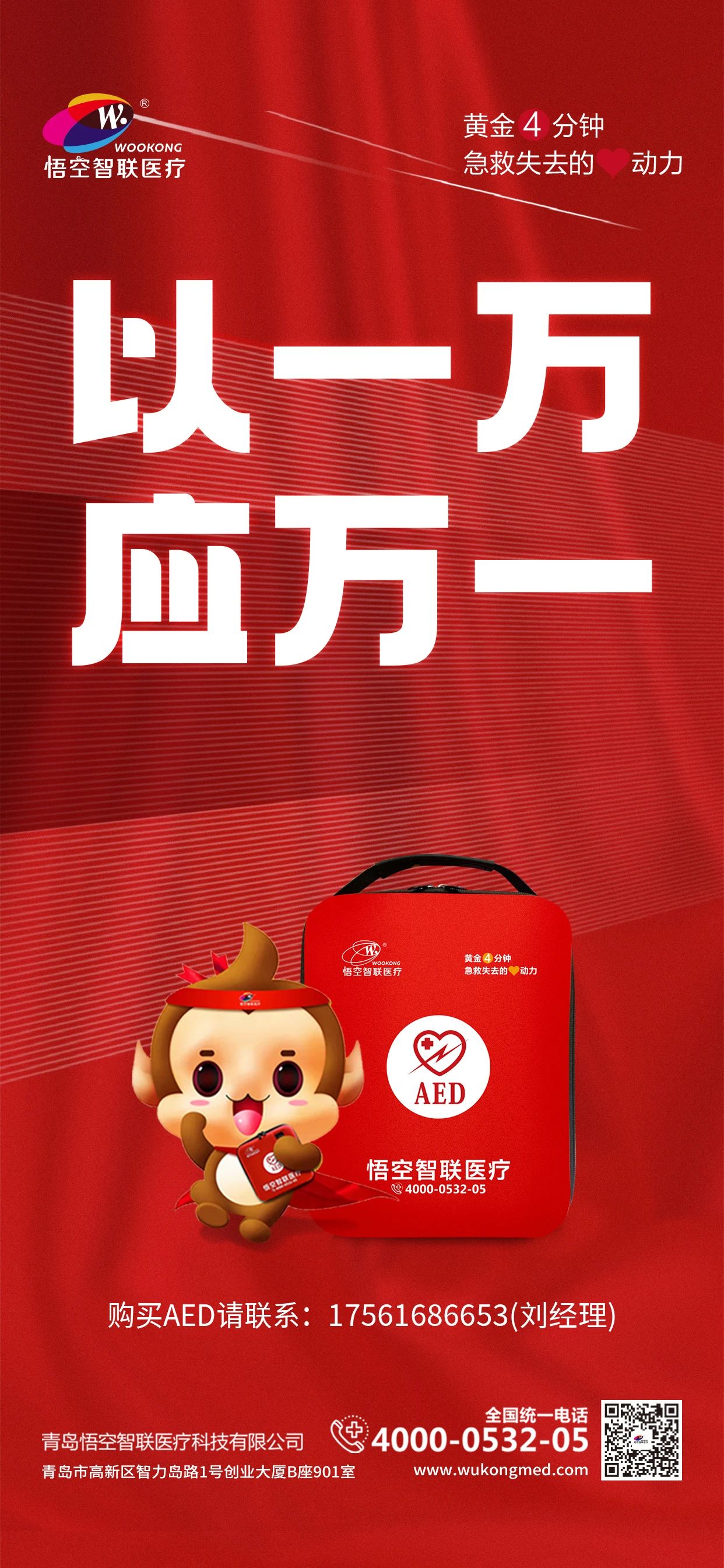青岛悟空医疗作为互联网+AED整合式服务专业团队,近年来,大力普及AED,提升市民应急能力,并为青岛市学校、公安、消防、宾馆、商场、景区、公园、社区、交通站点、文体场馆、便民服务中心等提供AED安装,以及操作培训。悟空医疗也组织多场“第一响应人”的培训强化AED使用常识,让市民掌握更多地自救和互救知识,不断提升人民群众的获得感、幸福感、安全感。
