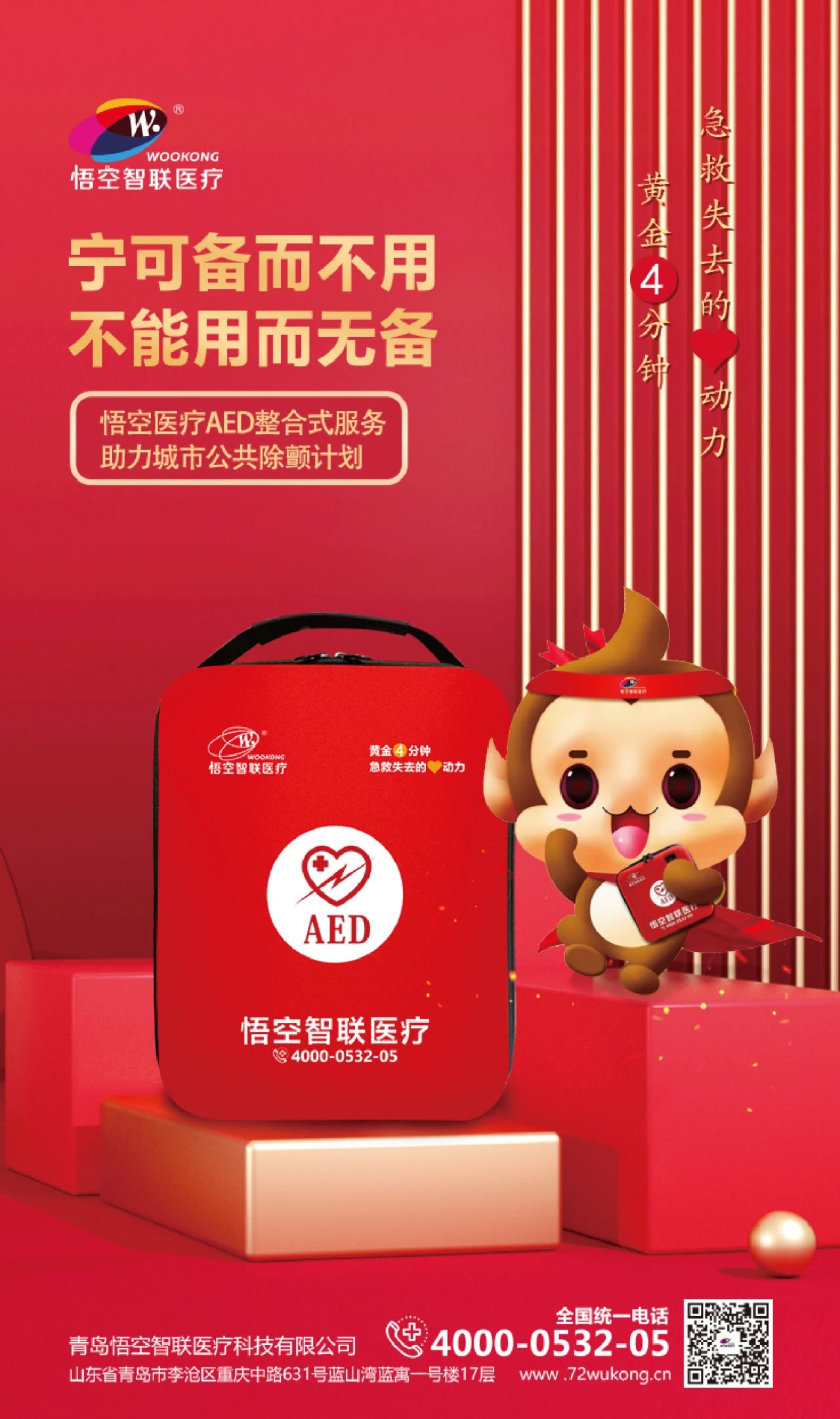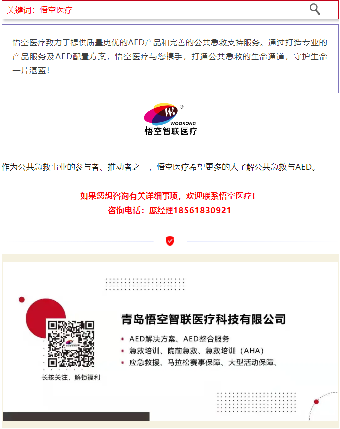 想了解更多悟空医疗AED的产品优势以及解决方案,欢迎联系咨询。悟空医疗AED期待与各路合作伙伴,携手共同推进AED部署进程,为公众的生命安全守好第一道防线。