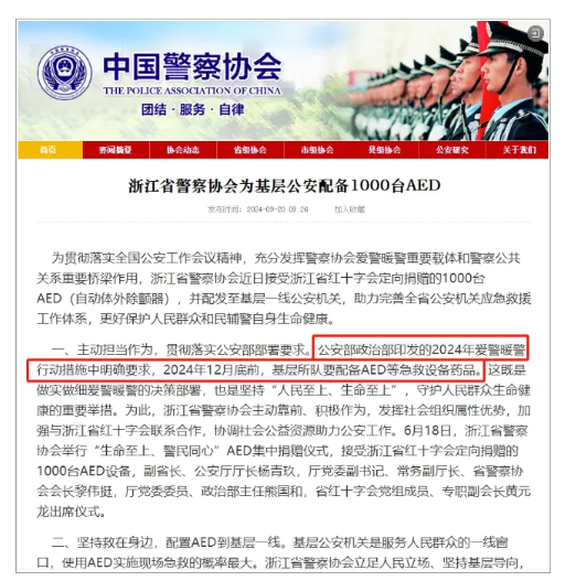 公安部政治部在2024年爱警暖警行动措施中明确要求,2024年12月底前,基层所队要配备AED等急救设备药品。这既是延续爱警暖警的决策部署,也是坚持“人民生命至上”的理念,守护人民群众和民辅警生命健康的重要举措。公安相关部门部署AED有助于提升社会的应急救护能力,加快应急救治的响应速度。