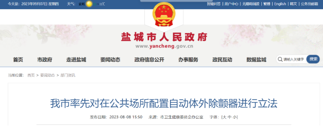 9月1日,盐城在全国率先出台并实施了公共场所配置自动体外除颤器(以下简称“AED”)的地方性法规。